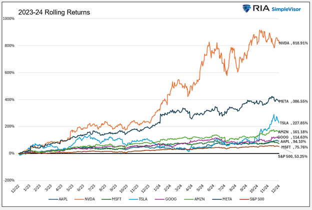 The graph and table below illustrate the remarkable outperformance of all the Magnificent Seven stocks in 2023 and 2024. The “worst” of the seven, Microsoft, still outperformed the S&P 500 by 22% over the two years. Others like NVDA, META, TESA, and AMZN lapped the market many times over.