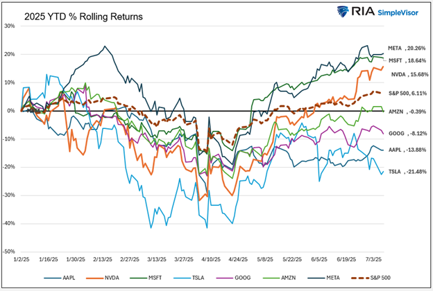The graph below shows that only three of the Magnificent Seven stocks are beating the S&P 500 through early July. Furthermore, Apple and Tesla are lagging the S&P 500 by 20% or more. Google is underperforming the index by 14%, while Amazon shares remain flat for the year in an up market. The other three stocks, META, MSFT, and NVDA, are outperforming the index handily, but not as significantly as they did in 2024 and 2023.