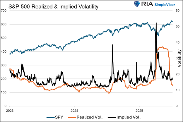 The graph below charts the S&P 500 ETF SPY against realized and implied volatility. As it shows, implied volatility was very low from mid-2023 through mid-2024. After that, implied volatility became more volatile. Unlike implied volatility, realized volatility was subdued until it spiked on April 5th, Liberation Day, and stayed elevated until recently. Both implied and realized volatility have reverted to early 2025 levels.