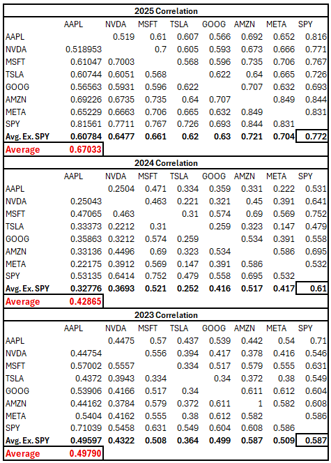 The tables below show the correlation between each Magnificent Seven stock and the S&P 500 (SPY). As shown, the average correlation among the stocks is running at .67 this year, compared to sub-50 levels over the last two years. Similarly, their average correlation to the S&P 500 is high at 0.77, up decently from the 2024 and 2023 levels.