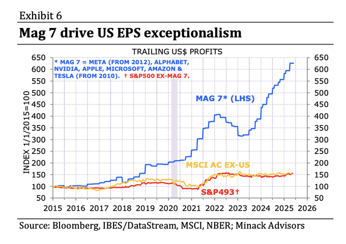 Fundamentals also underpin this market's resilience. Employment added 147,000 jobs in June, while in a weakening trend, it is still growing. However, corporate earnings grew steadily across sectors, and the tech-heavy “Magnificent 7" continues to deliver strong results, driving much of the rebound. Despite headlines suggesting Europe is the place for growth, the "Mag 7" stocks drive corporate earnings versus the rest of the index and the world. (h/t @eggswhite)