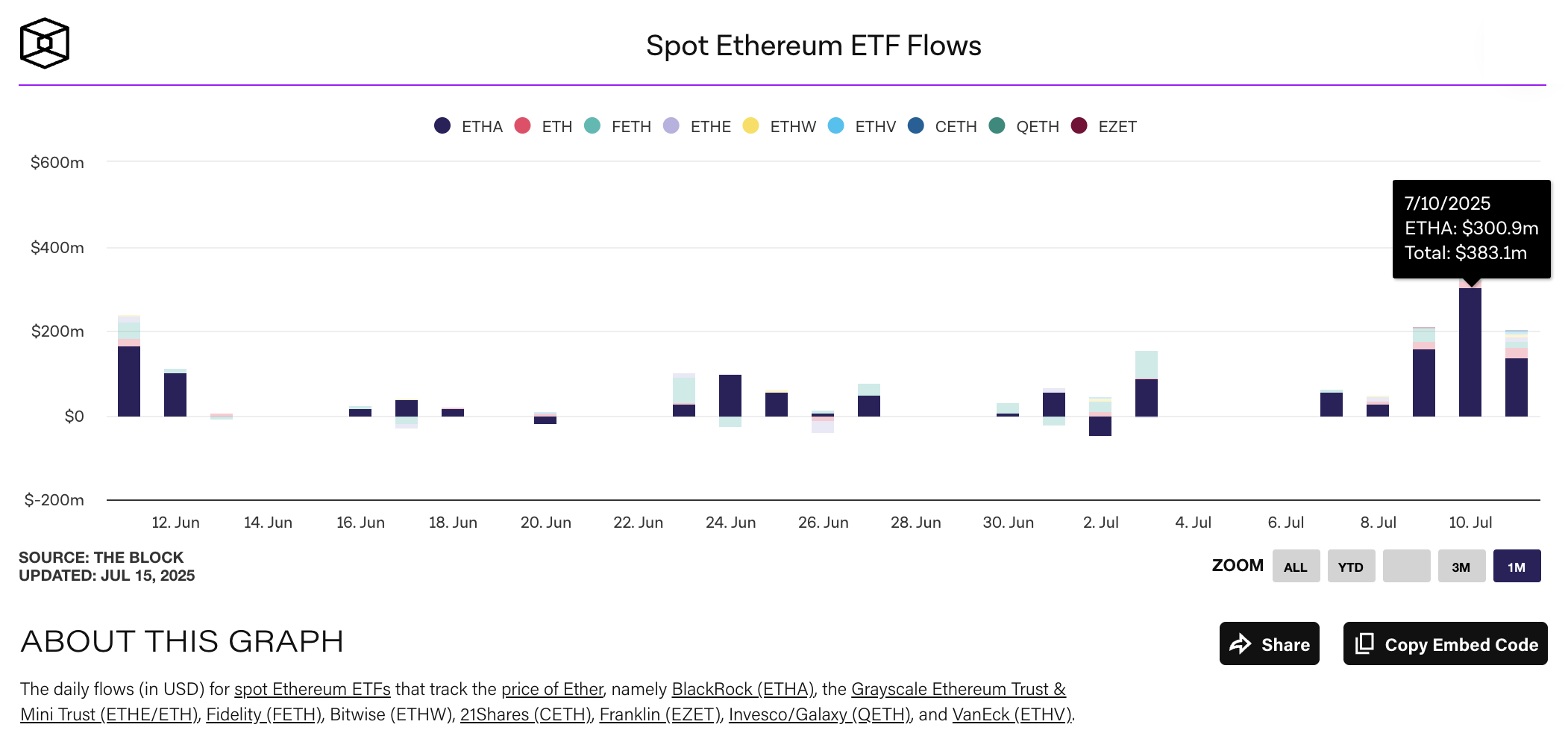 Ether ETFs are also seeing record inflows. On July 10, US spot ether ETFs attracted a total of US$383.1 million in net inflows. BlackRock’s iShares Ethereum Trust (ETHA) led with a record of US$300.9 million in net daily inflows, according to data from The Block. Fidelity’s FETH, Grayscale’s ETH and ETHE, Bitwise’s ETHW, and VanEck’s ETHV, registered US$37.3 million, US$20.7 million, US$18.9 million, US$3.2 million, and US$2.1 million in net daily inflows, respectively.
