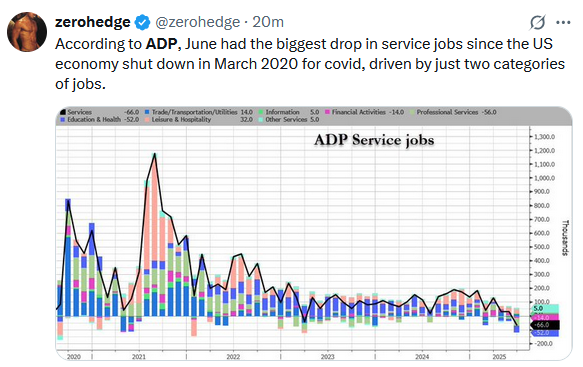 While it's easy to blame tariffs for recent weakness, the Tweet of the Day, courtesy of ZeroHedge, below shows something more concerning. According to the ADP, June saw the largest decline in service sector payrolls (-66,000) since March 2020. While 52k of the losses came from education and health, which tend to be seasonally volatile, the trend is poor. The current estimate for the BLS is +100k. ADP data argues we could get a surprise catch down. Stay tuned!