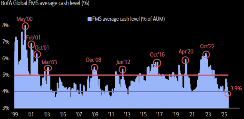 While the market is currently bullish, sentiment among both retail and professional investors has surged to more extreme bullish levels. Fund managers, in particular, who were lagging the bull market advance, have seen the biggest three-month rise in risk appetite...ever.