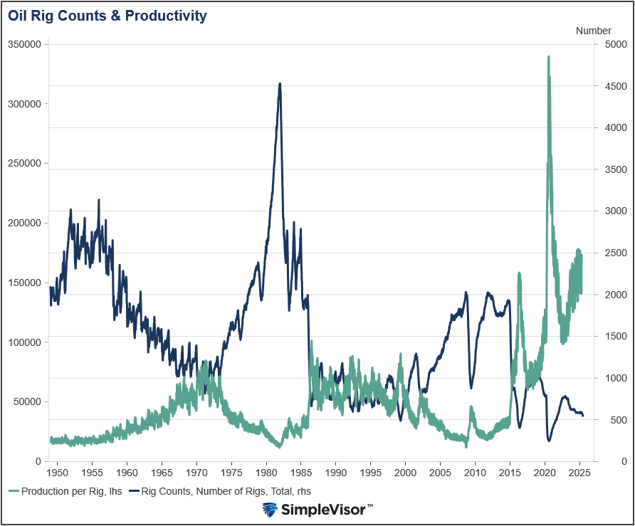 With weak oil prices and President Trump's "Drill Baby Drill" mantra, oil rig counts are falling. Such a correlation is expected, as the number of oil rigs typically correlates with oil prices, representing profitability for drillers. Year-to-date, the number of rigs, as reported by Baker Hughes, has declined by 9%. Therefore, one would also expect oil production in the US to fall by a similar amount. Despite what may seem obvious, oil production has only declined marginally year to date.