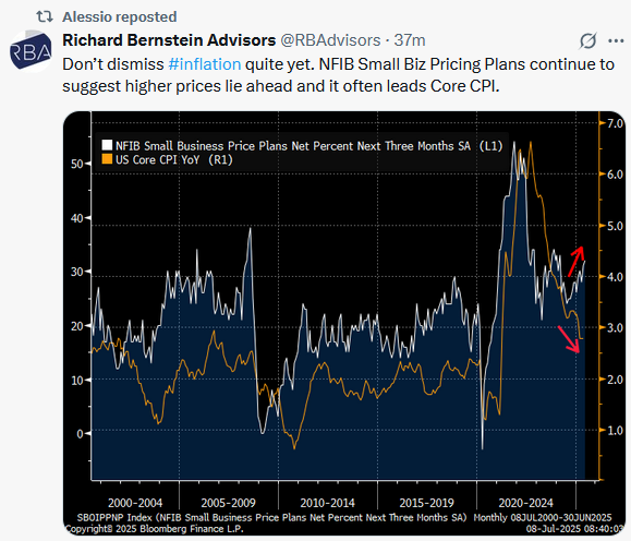 As noted yesterday, the market is still struggling with overbought conditions and was weak again yesterday. The S&P 500 closed slightly lower by 0.1%, snapping a brief winning streak as tariff-related jitters resurfaced. President Trump extended the implementation of reciprocal tariffs from July to August 1 but simultaneously warned 14 countries—including Japan, South Korea, and members of the BRICS bloc—that steep duties would be imposed unless new trade deals were reached. These developments injected renewed volatility into markets, driving a surge in copper prices—up nearly 13% in one session, the largest gain since 1968—as traders positioned around potential supply shocks and global industrial disruption. Treasury yields edged up to 4.42% and the U.S. dollar firmed, reflecting a cautious, risk-off tone in global capital flows.