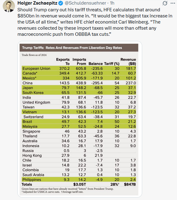 As Goldman Sachs noted, the expectations bar is low and will be cleared (analysts forecast S&P 500 EPS YoY growth will decelerate to just 4% in 2Q from 12% in 1Q). At a high level, the focus will be on the impact of tariff policies on margins, sales, and investment spending. The current expectation is for consumers to take the brunt of the tariff cost burden (economists think they will absorb 70% of the cost), but if not, it will impact corporate margins. Of course, with inflation not budging, the implication is that consumers haven't borne the brunt of the tariff cost burden, as in any of it. Since corporations aren't issuing profit warnings, the conclusion is simple: foreigners are paying the tariffs, just as Trump said they would.