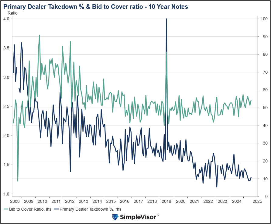 Bottom line, as all four bullet points describe, it was a very good auction. The second graph below shows that primary dealers have been taking increasingly smaller portions of ten-year auctions. Despite the hostile rhetoric, this suggests that investors are meaningfully buying bonds at the auctions.