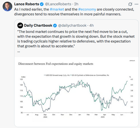 However, we are starting to see some cracks in that particular trade, which could result in a more significant market correction over the next few months. Notably, the timing of that potential unwind is the most difficult. The problem with momentum is that, like a speeding locomotive, it is tough to stop. As such, it can take some time for the cracks in the "momo" trade to show up in the broader market. Given the high levels of complacency, there seems to be a more substantial risk of something breaking today, versus what we saw back in early April.