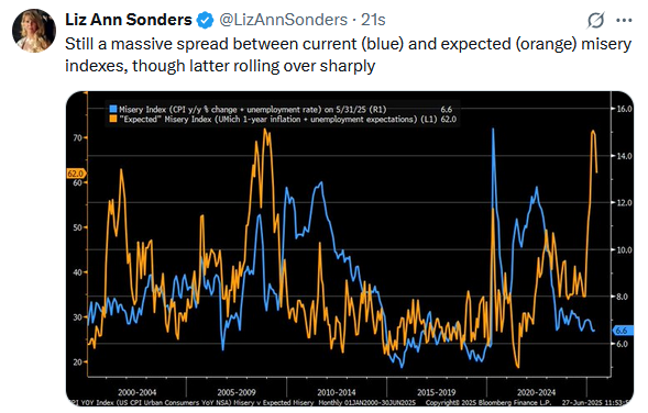 Macro tailwinds currently support higher stock prices, particularly with the Q2 earnings season about to start. Cooling inflation data like PCE (2.3% YoY, slight uptick in core) and progress in geopolitical fronts, including a potential truce in the Israel–Iran conflict, is also boosting sentiment. Meanwhile, caution flags are raised by CFO surveys, even though 78% of investors are optimistic, only 43% of CFOs share that enthusiasm.