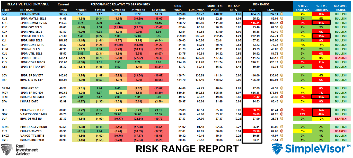 In the financial markets, longer-term moving averages (means) are like gravity. When things deviate too far from those averages, in one direction or another, a "reversion to the mean" will eventually occur. Currently, the S&P 500 itself is 10% above its long-term mean, which is rather extreme, but Communications (14%), Technology (15%), Emerging Markets (13%), and Gold (14%) are pushing more historic extremes. But I don't think I have ever seen a deviation of 40% as we currently see in Gold Miners. Investors should consider rebalancing risk in these sectors, as eventually the "gravitational force" of the long-term means will win.