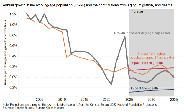 Lastly, the most overlooked driver of disinflation is the decline of demographics in the U.S. The population is aging, and the U.S. workforce growth rate is falling. Immigration has slowed. Birth rates are down. Fewer workers and more retirees result in lower production and consumption. Older people spend less. They don’t buy homes, take out loans, and live on fixed incomes, which translates to lower economic velocity.