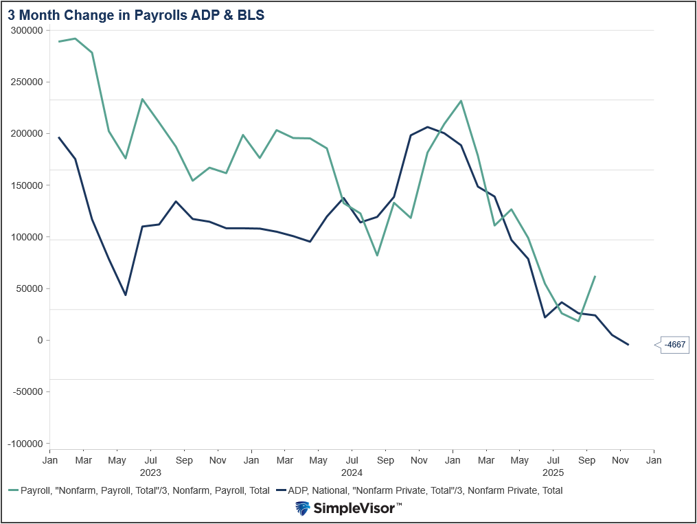 Government economic data will resume in earnest this week. On Tuesday, the BLS will provide the employment report. The current estimate is for a mere 25k job growth, with the unemployment rate sticking at 4.4%. The graph below compares current ADP data with lagging BLS employment data to help us appreciate the weakness that may likely show up in the unemployment report.