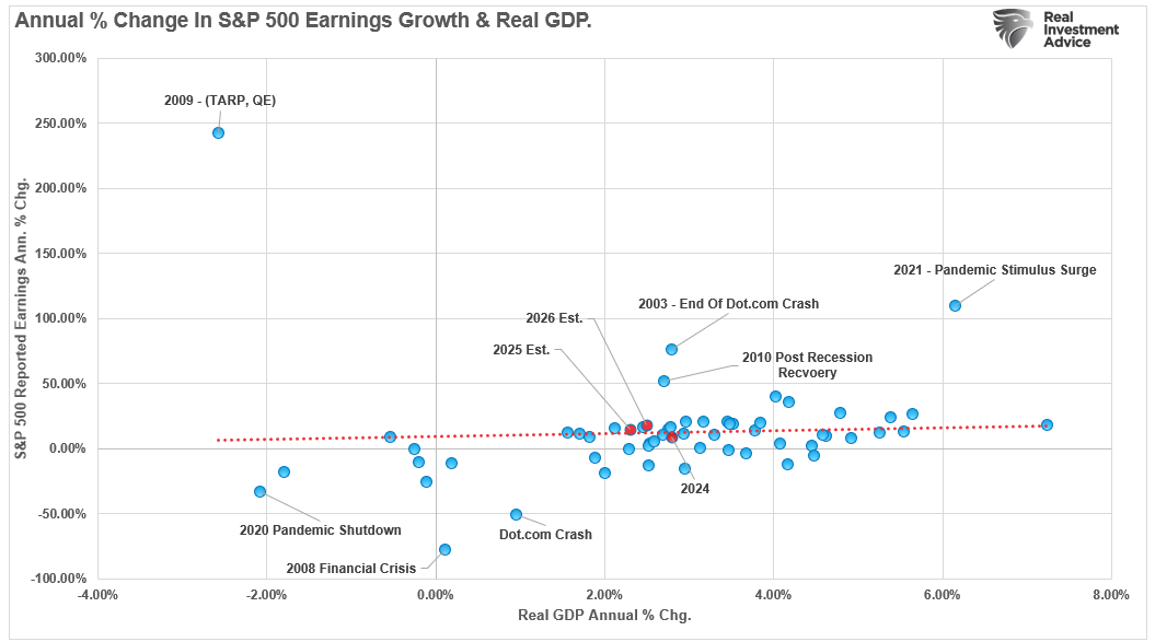The most considerable risk to investors is that the 2026 earnings estimates, which are the most deviated above its 125-year growth trend, disappoint, and the markets reprice lower. As shown, historically, when earnings become deviated from actual economic activity, the mean reversion process is not kind to investors.