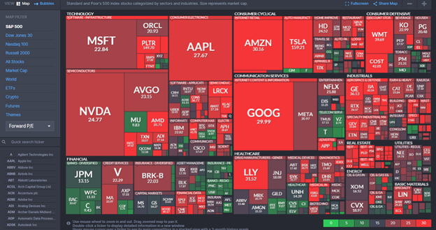 The heat map below shows forward P/Es. The “E” in these calculations is based on forward one-year earnings estimates. The graphic still shows many red boxes, but fewer are bright red, and more are neutral or green. Forward P/E ratios are not as stretched as trailing P/E ratios.
