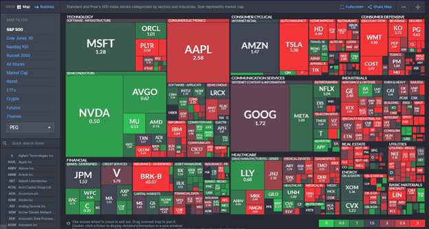 The graphic below shows that the heat map using PEG ratios tells a very different story from the two heat maps we showed earlier. Some traditional value stocks and sectors, like consumer defensive (staples) and utility stocks, are predominantly bright red or greater than 1.0. At the same time, some of the fastest-growing companies that were deemed expensive in the first two maps are near or below 1.0.