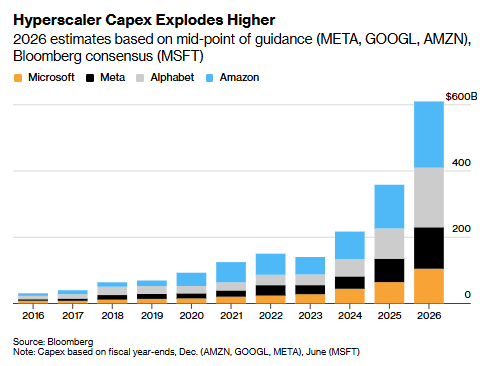 The current rotation contains a modern twist. Artificial intelligence spending (CapEx) has pushed demand into grid buildouts, power generation, turbines, switchgear, cooling, metals, chemicals, and construction services. Those capital expenditure levels are enormous.