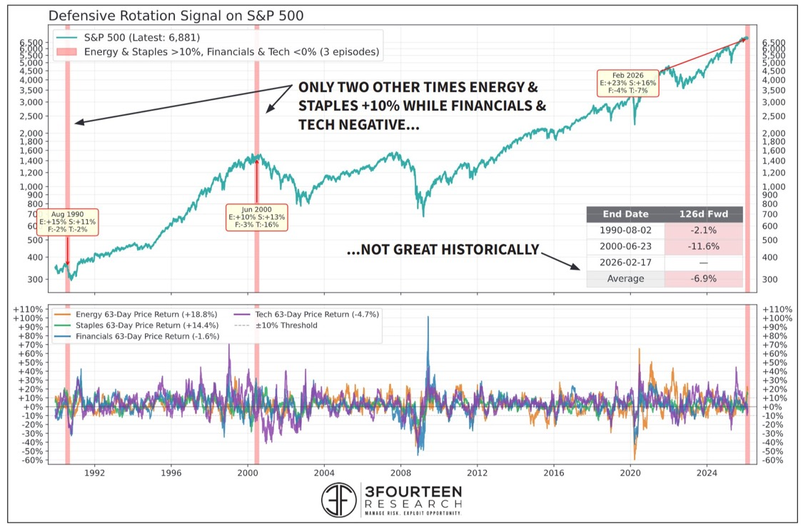 "While the S&P is only about 2% off its all time highs, beneath the surface the market is showing signs of a top. Warren Pies tweeted today that there have only been two other times when Consumer Staples and Energy have been up more than 10% and Technology and Financials negative over the previous 63 trading days: 1990 (Desert Storm) and 2000 – both of which were tops. Health Care – another defensive sector – has also been outperforming the S&P of late."