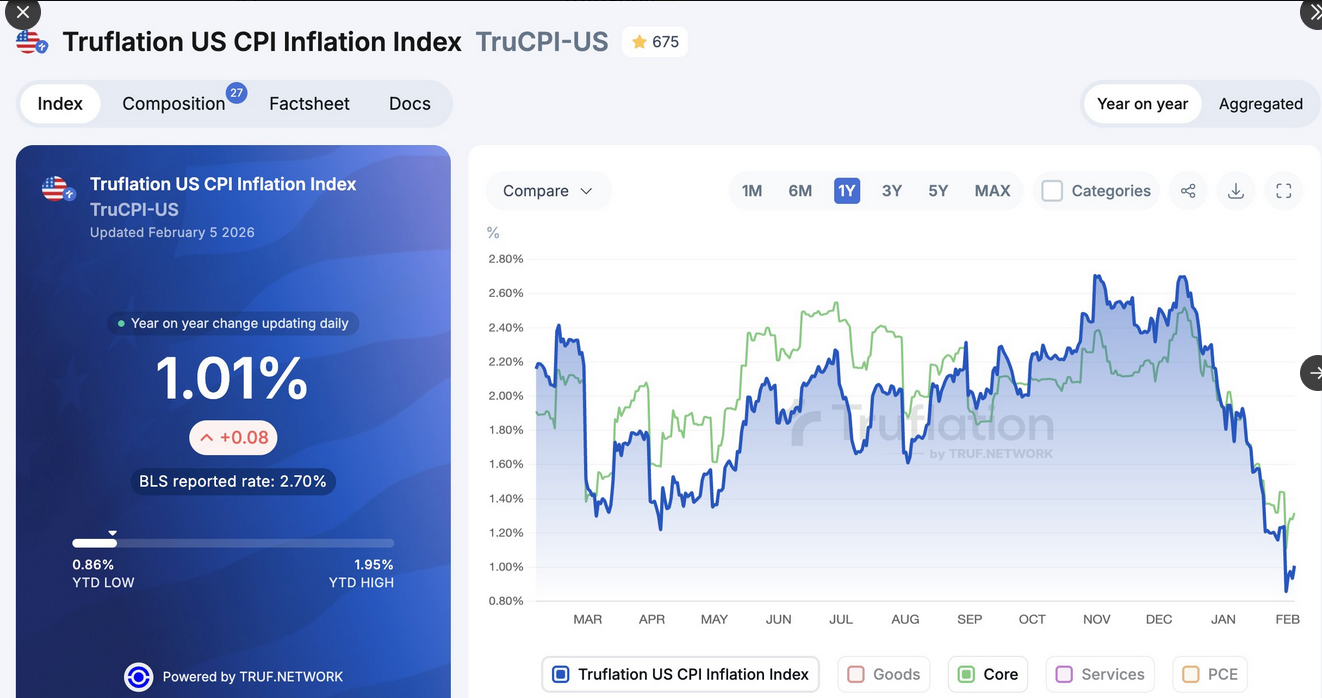 The economic calendar will be busy this week. Retail Sales on Tuesday will provide our first account of consumer activity after the holiday season. The following day, the BLS will release the delayed employment report originally due last Friday. Expectations are that 50k jobs were added last month. Unemployment is expected to tick up 0.1% to 4.5%. ADP data warn that the number could be lower than consensus expectations. On Friday, the BLS will release CPI. We are very interested in seeing whether the government's inflation data shows a similar sharp decline, as Truflation (shown below) did in January. It's worth adding that Friday's University of Michigan one-year inflation expectations fell from 4.00% to 3.50%.