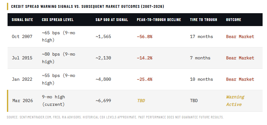 It isn't the absolute level of the CDX that matters, but the direction of travel and the rate of change. If investors wait for the "spike," it will likely be too late to act. Sentiment Trader's nine-month high threshold isn't about measuring the peak of a crisis; it is a warning of a potential turn. Credit stress doesn't arrive fully formed. It builds. Each of the prior signals triggered before the real damage was done, precisely because spreads were starting to move, not because they had already maxed out.
