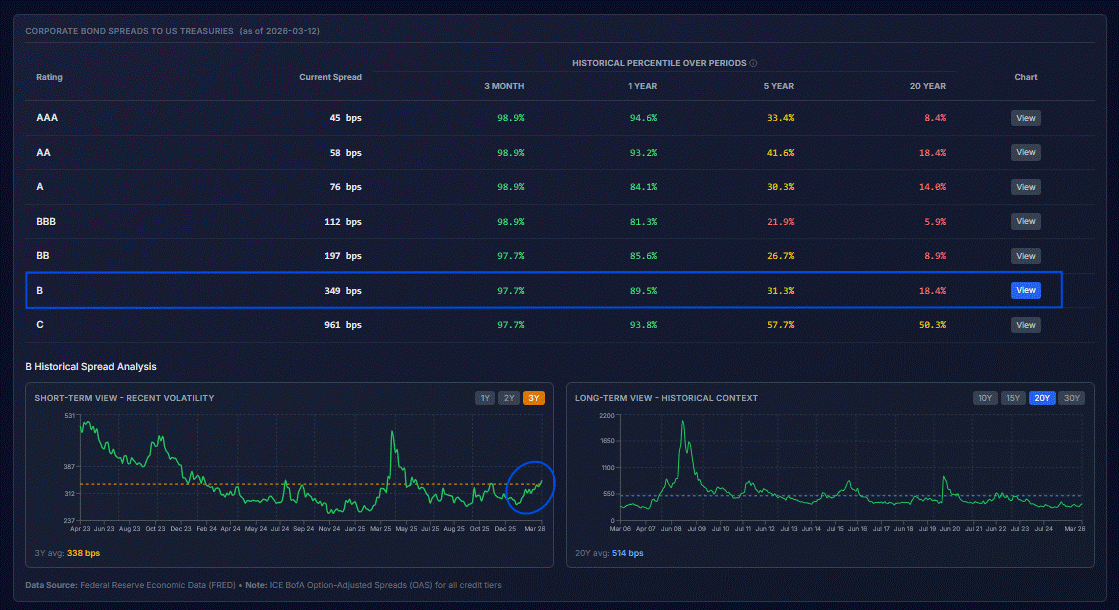 Following the posting of our article, Private Credit Stress, we received a few emails asking how to track private credit funds. Obviously, the media and its recent barrage of headlines about redemption gates and credit losses is a helpful start. Beyond the media, there are a few market sources worth tracking. One such indicator of credit is the spread between junk bond yields and US Treasury yields. In the first screenshot below, courtesy of the soon-to-be-released new version of SimpleVisor, junk spreads have widened, but as shown in the bottom-right graph, over the longer term, the uptick is not very noticeable. Corporate spreads can be helpful to a degree, but they can be very misleading, as there is significantly more liquidity in the bond markets than in private credit markets.
