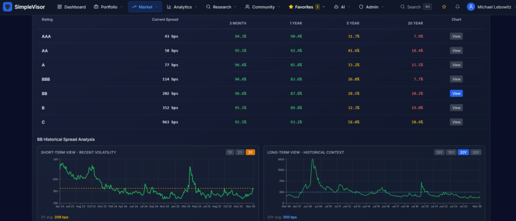 Track credit spreads on SimpleVisor. As we show below on our soon-to-be-released version, spreads have been widening, but on a long-term basis, they remain very tight.