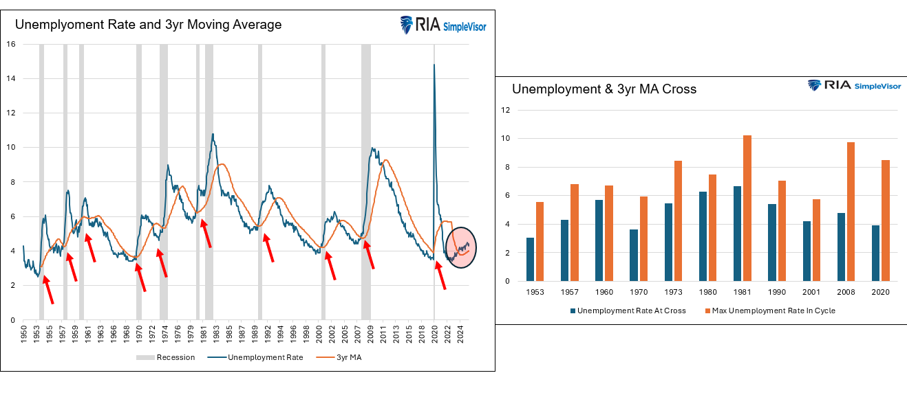 - On average, the unemployment rate rose by 2.60% after crossing its moving average. The minimum increase, in 1960, was 1.00%. The bar chart on the right shows each instance.