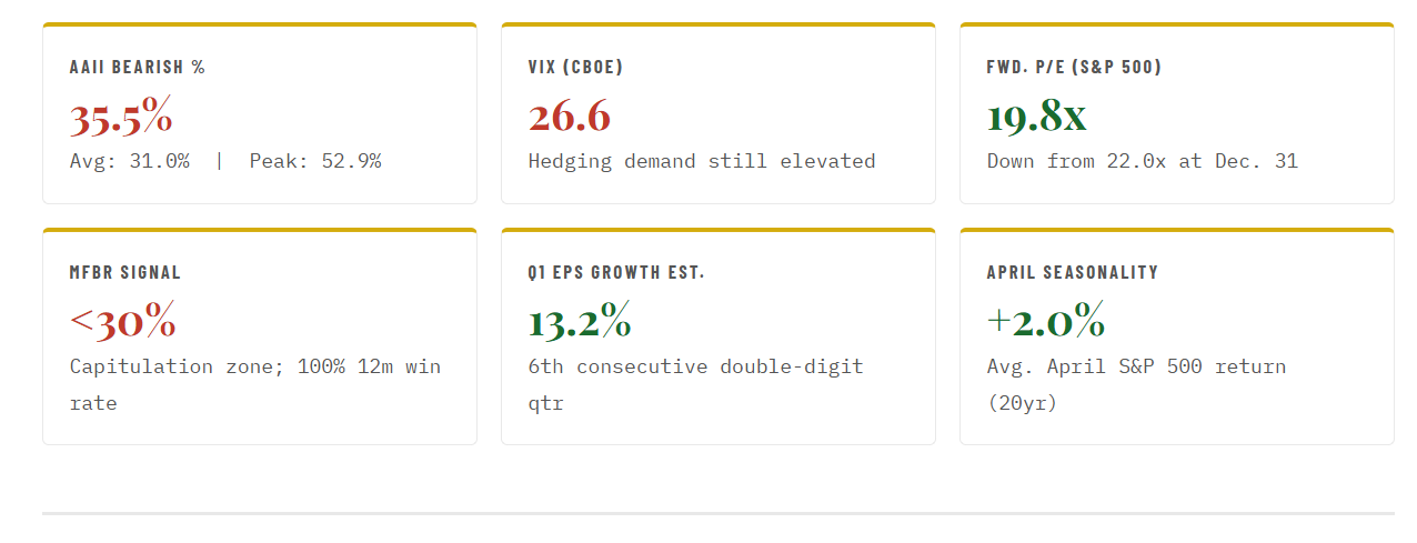 This isn't the environment to aggressively add exposure to risk. However, we can selectively add to our holdings heading into the Q1 earnings season. However, we are still maintaining a short leash in case things reverse quickly. The combination of a recaptured 200-day moving average, extreme bearish investor sentiment that has historically resolved higher, deeply depressed put-call ratios acting as coiled fuel for any upside surprise, a Q1 earnings season entering with a low bar and improving guidance, and valuations that have genuinely reset from their January extremes, that's a setup that demands action. Not reckless action. Measured action.
