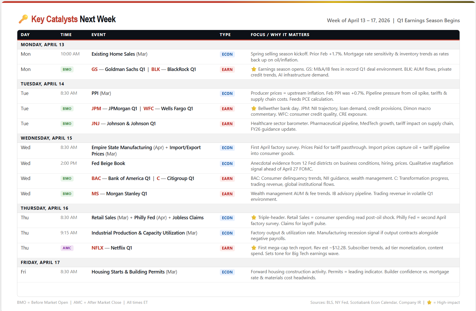 On the economic side, Tuesday's March PPI is the upstream inflation signal; February ran hot at +0.7%, and feeds directly into the PCE calculation that the Fed watches. Wednesday's Beige Book provides the qualitative color from all 12 Fed districts ahead of the April 27 FOMC. But Thursday is the marquee data day: March Retail Sales will reveal whether the consumer held up amid oil at $100+ and tariff price hikes; Philly Fed is the second April factory survey, alongside Empire State from Wednesday; and Industrial Production will tell us if factory output contracted alongside the negative payrolls trend. Netflix, after the close on Thursday, will be the first mega-cap tech to report and set the sentiment template for the Big Tech earnings wave that follows.