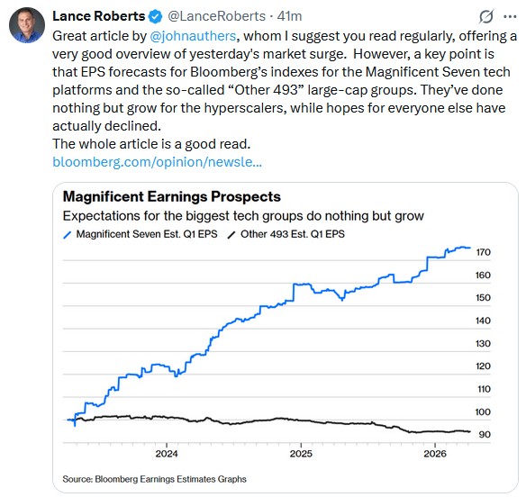 Yesterday, we discussed the market's rally back above the 200-DMA, which was accomplished in less than 4 weeks, which bodes well for returns over the next 3-6 months. Notably, next week, Wall Street heads into Q1 2026 earnings season with unusually high expectations.