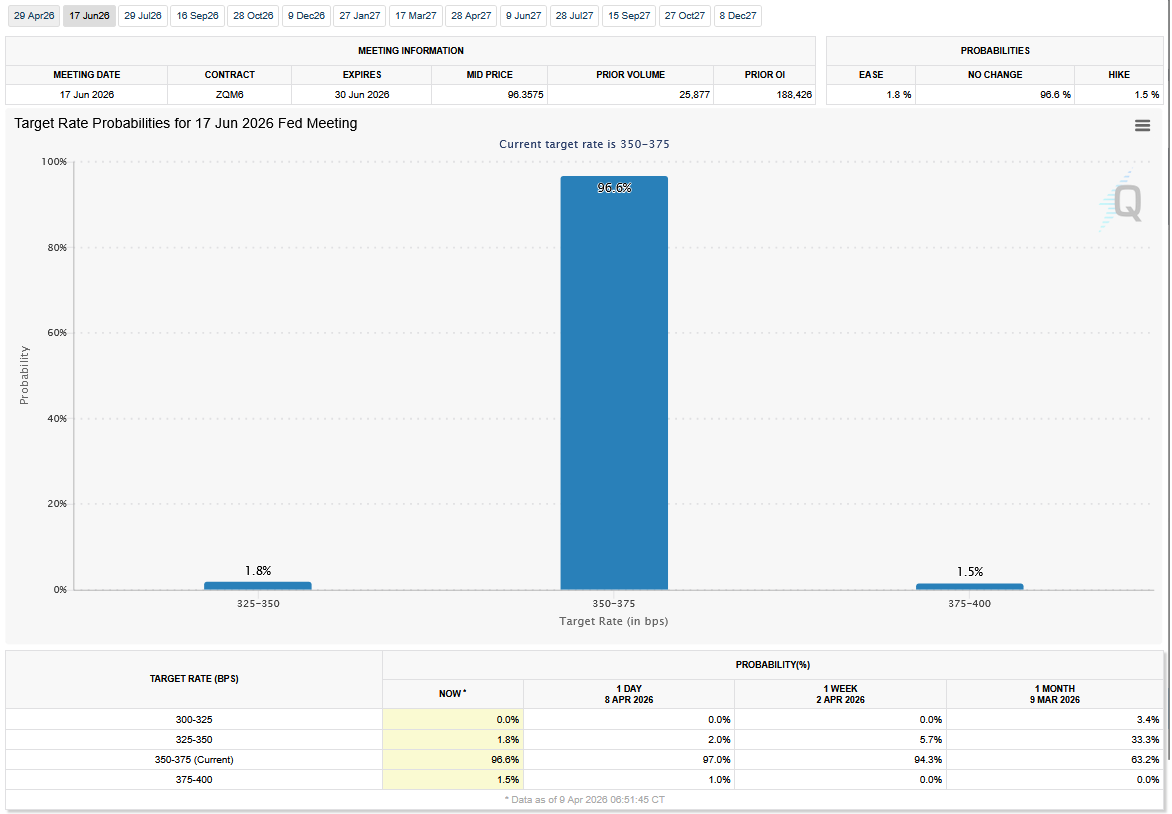 The FOMC released minutes from its March 18th meeting. The minutes generally followed what we learned from Powell on that same day. Simply, the Fed will wait, watch, and stay nimble. The Iranian conflict is temporarily clouding the inflation picture, making it wise, in their opinion, to do nothing until they know more. As we share below, the market is betting they do not touch rates for at least the next two meetings.