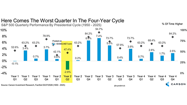 We're in Year 2 of the presidential cycle, and Q2 of Year 2 is the worst quarter in the entire four-year rotation. According to Carson Investment Research's FactSet data going back to 1950, the second quarter of the second year of the Presidential cycle has produced an average negative S&P 500 return of -2.8%. Furthermore, the index finishes higher only 47% of the time.