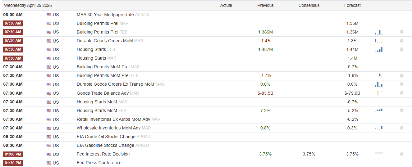 Today brings a true gauntlet for markets. Microsoft, Amazon, Alphabet, and Meta all report after the close, and the FOMC delivers its policy decision midafternoon. Roughly 40% of the S&P 500's market cap hands over its outlook in a single window, and the Fed gets to set the tone for risk appetite right before the bell. As I wrote last week, when the calendar concentrates this much catalyst into one session, the asymmetry tilts against complacent positioning.