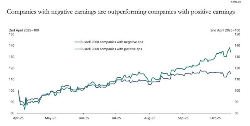 The chart below, courtesy of Apollo’s Torsten Slok, shows that small-cap companies with negative earnings have outperformed small-cap companies with positive earnings by about 30% since early April. Per Torsten: “Something remarkable is going on in the equity market. Stock prices of companies with negative earnings have in recent months outperformed stock prices of companies …