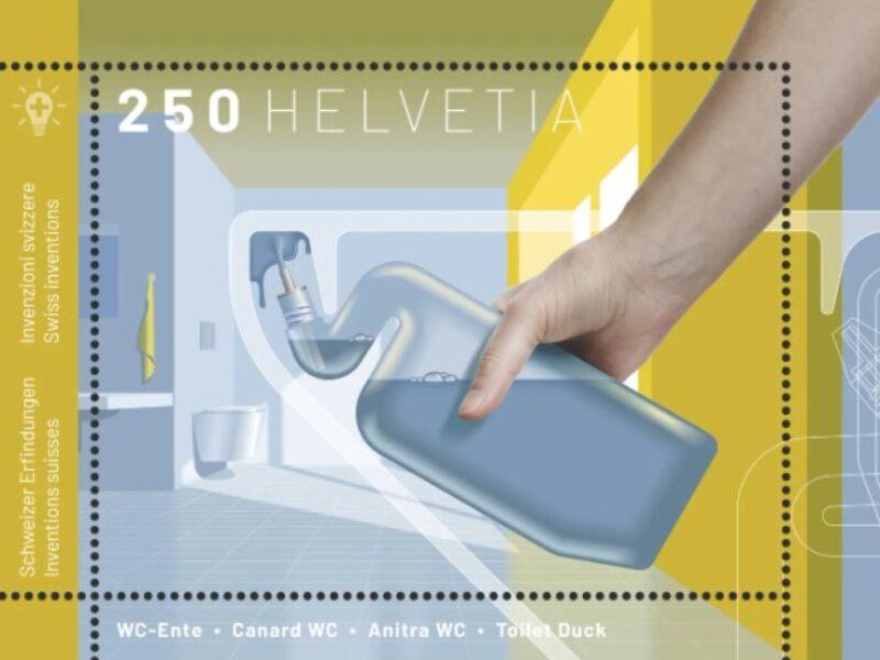 Swiss Post has launched a stamp featuring an image of the Duck toilet cleaning dispenser, as part of a series honouring Swiss inventiveness. When rubbed with fingers, the stamp emits the citrus cleaning scent associated with the product. +Get the most important news from Switzerland in your inbox The toilet cleaning bottle with a curved …