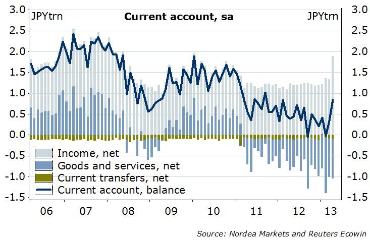 As we expected in our “Move slowly in USD/JPY short positions until September 2013″, written in January 2013, the Japanese current account has moved into positive territory, while the US deficit remains deeply red.