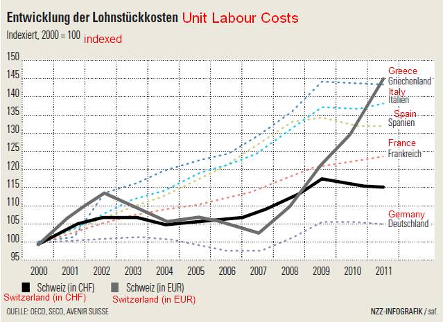 The following graph shows that when compared to the year 2000, manufacturing costs in Switzerland (valued in EUR) rose as much as the ones in Greece, but they remained very low in Germany.