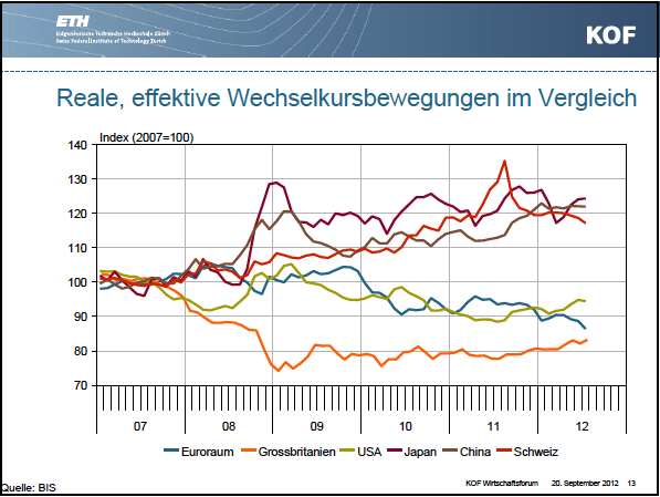 The following interesting graph from the main Swiss economic research institute KOF shows that by September 2012 the real effective exchange rate of the Swiss franc had risen by 19% against the 2007 levels, but the one of the Chinese Yuan (CNY) by 25% and the one of the Japanese Yen by 23%. On the other hand the UK, the US and the euro zone have seen a depreciation of their currencies. Inflation is represented by the word “real” inside the “real effective exchange rate”.