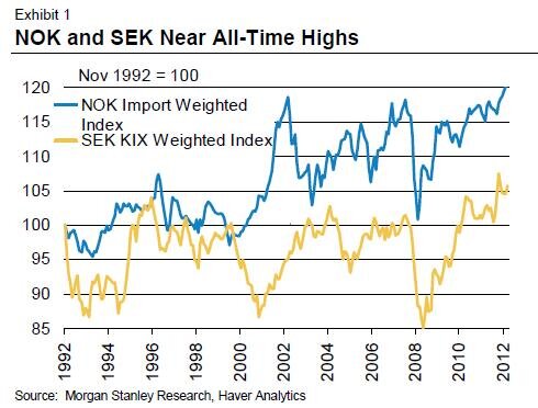 Effectively the Swiss franc appreciation from around 96 to 114 seems to be similar to the one of the Swedish Krona and the Norwegian Krone until 2012, but as opposed to the SNB, the Swedish Riksbank is happy with the SEK exchange rate.