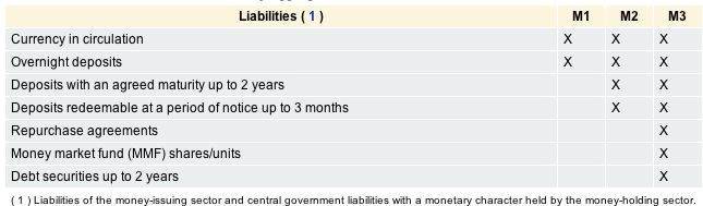 M1: Defined as currency in circulation (bank notes/coins), sight deposits at banks, postal accounts and transaction accounts of non-banks.