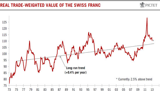 Already with Swiss inflation of around 1%, the franc will free float again, which could happen in 2014 or 2015. Real US rates of minus 2% will result in inflows into the CHF. Due to positive market sentiment, the franc could depreciate in the meantime. This will lead to higher inflation and an earlier introduction of the free float.A second scenario is an end to QE3 due to inflation pressures despite continuing high structural US unemployment and low growth (see Bill Gross). In this case, markets will be under strong pressure and this will trigger inflows in the franc and the yen. We judge that over the long-term the partially Fed-financed increase of US real estate prices is not sustainable, while QE3 certainly helped to prevent a collapse of the global economy and to end the biggest fears in the euro crisis.