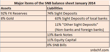 This link to the SNB website gives insights into how many francs the Swiss National Bank requested commercial banks to deposit, here our detailed overview of the weekly change since the beginning of 2012. Whenever somebody anywhere in the world wants to buy a Swiss asset, a Swiss house, a Swiss stock or just francs in cash and the price comes close to EUR/CHF 1.20 or the equivalent in other currency, then the SNB says: “You can get it cheaper than the usual market price, I will give you francs, you give me the foreign currency.” All central banks obey to simple accounting procedures. With more foreign currency aka assets, the central bank increases also its liabilities. The increase of debt is sometimes called “money printing”. Money printing is just a technical accounting process, but not printing real bank notes. It means Minus (or liability) for the SNB, Plus (or more assets, more reserves) for the banks. Keep in mind that in the case of interventions the central bank is the initiator of rising bank reserves, and not as usually the lending process. If the SNB had not intervened the whole process would not have touched the SNB balance sheet, but the EUR/CHF price would have been far lower than 1.20. |
