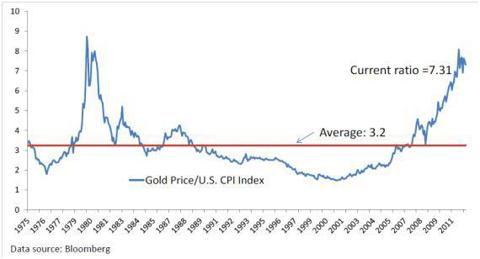 Similar as Bill Gross we judge that U.S. inflation might pick up in the coming years because the job market is structurally split in people “in the labor force” and the ones “out of the labor force”. Higher wages for the first group might lead to higher price inflation over the longer term, but the Fed will still be reluctant to hike interest rates because of the second group and high public debt. Core CPI inflation in both Europe and U.S. of nearly 2% despite high unemployment is a symptom of central banks flying blind into unscattered territory.Markets, however, did already anticipate high future U.S. inflation, visible in the increase of gold/US CPI ratio that has recently fallen under 7.