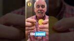 He shows a real American Gold Eagle and a fake American Gold Eagle, and then does a ping test to let the audience hear the audible ring of the genuine gold coin and the clunky clangy tone of the fake gold coin.